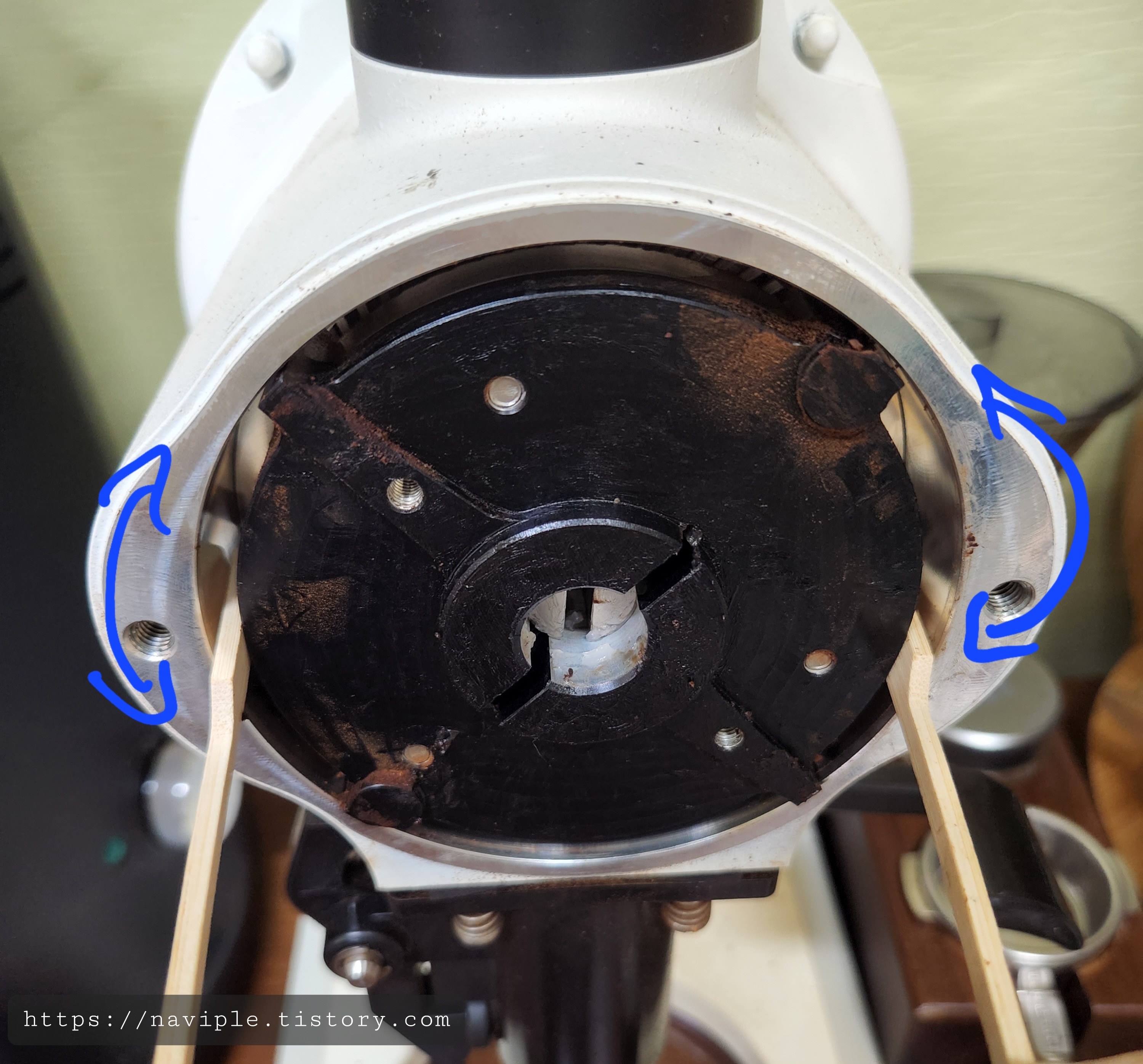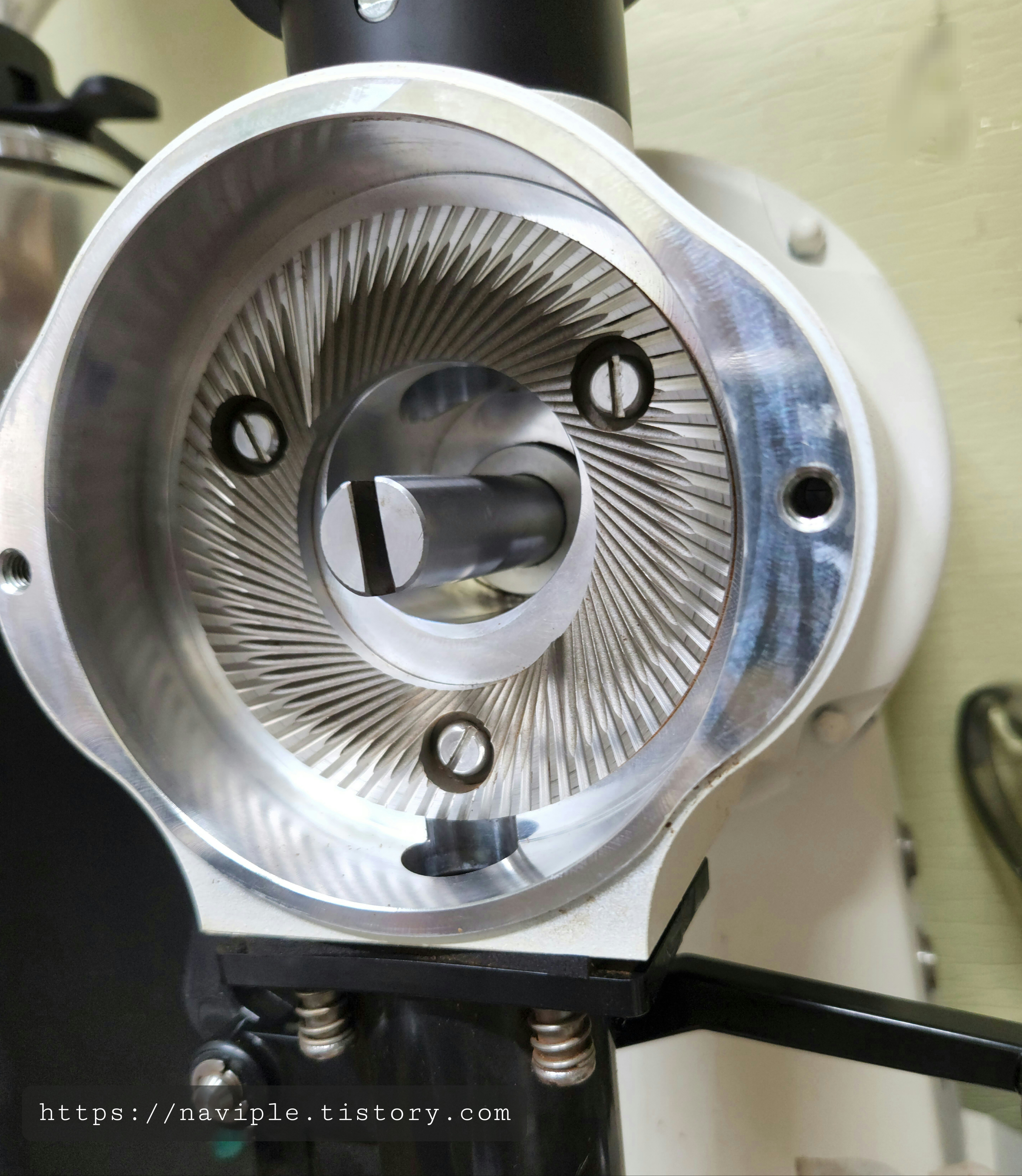 반대로 분쇄도 조절을 풀어 원판이 안쪽으로 들어가면 버 안쪽의 스프링이 버를 밀어주어 분쇄도가 풀리게 됩니다.