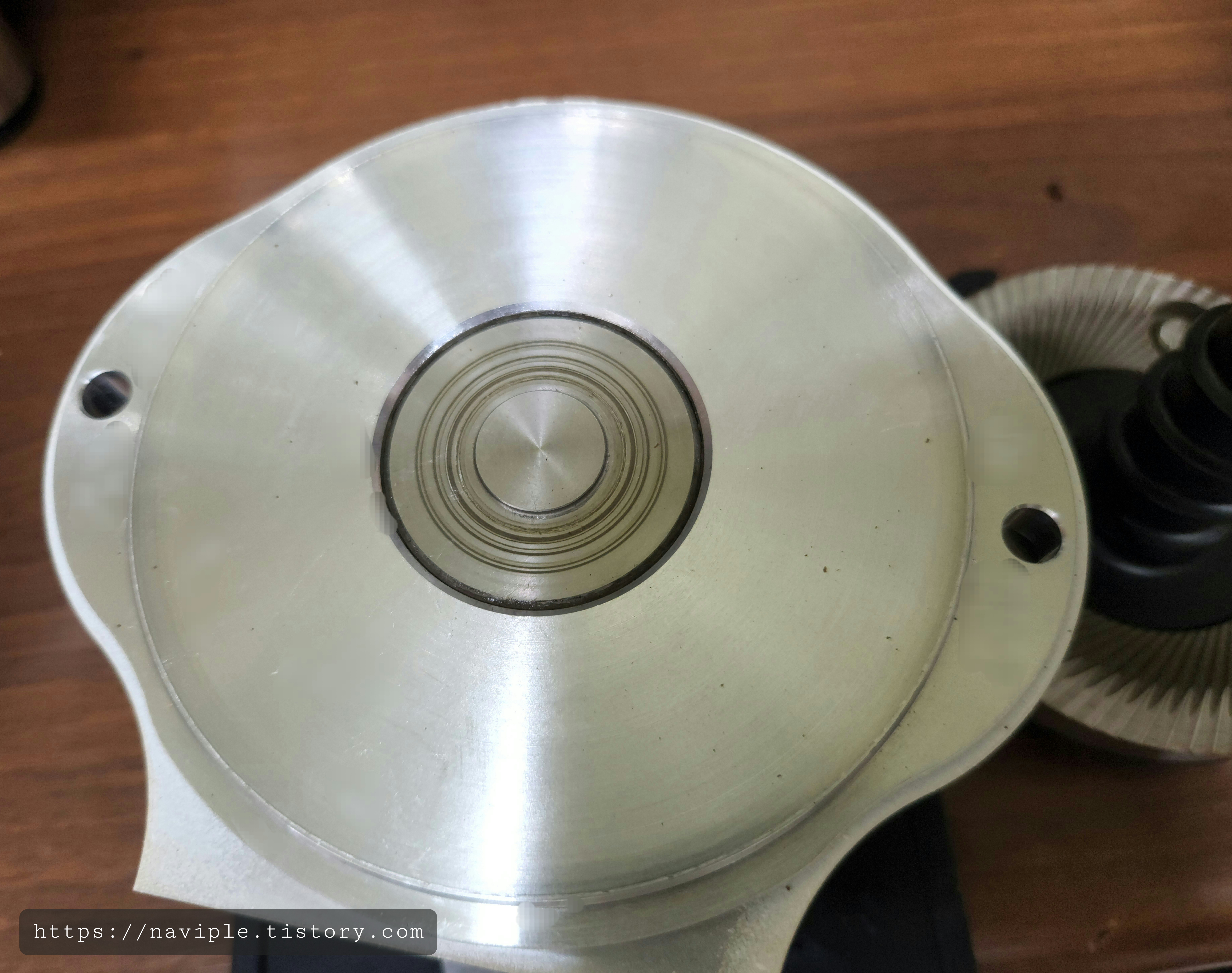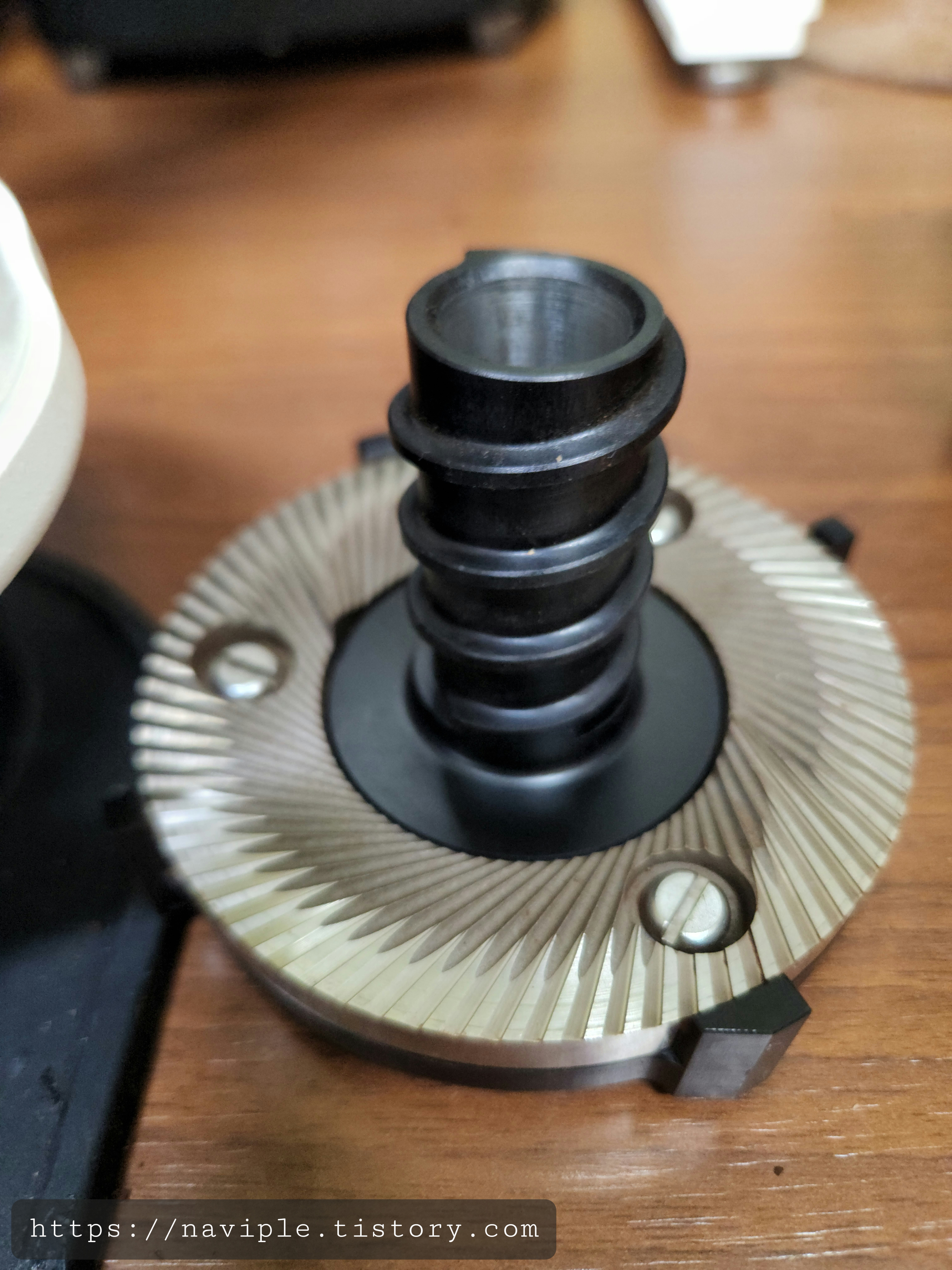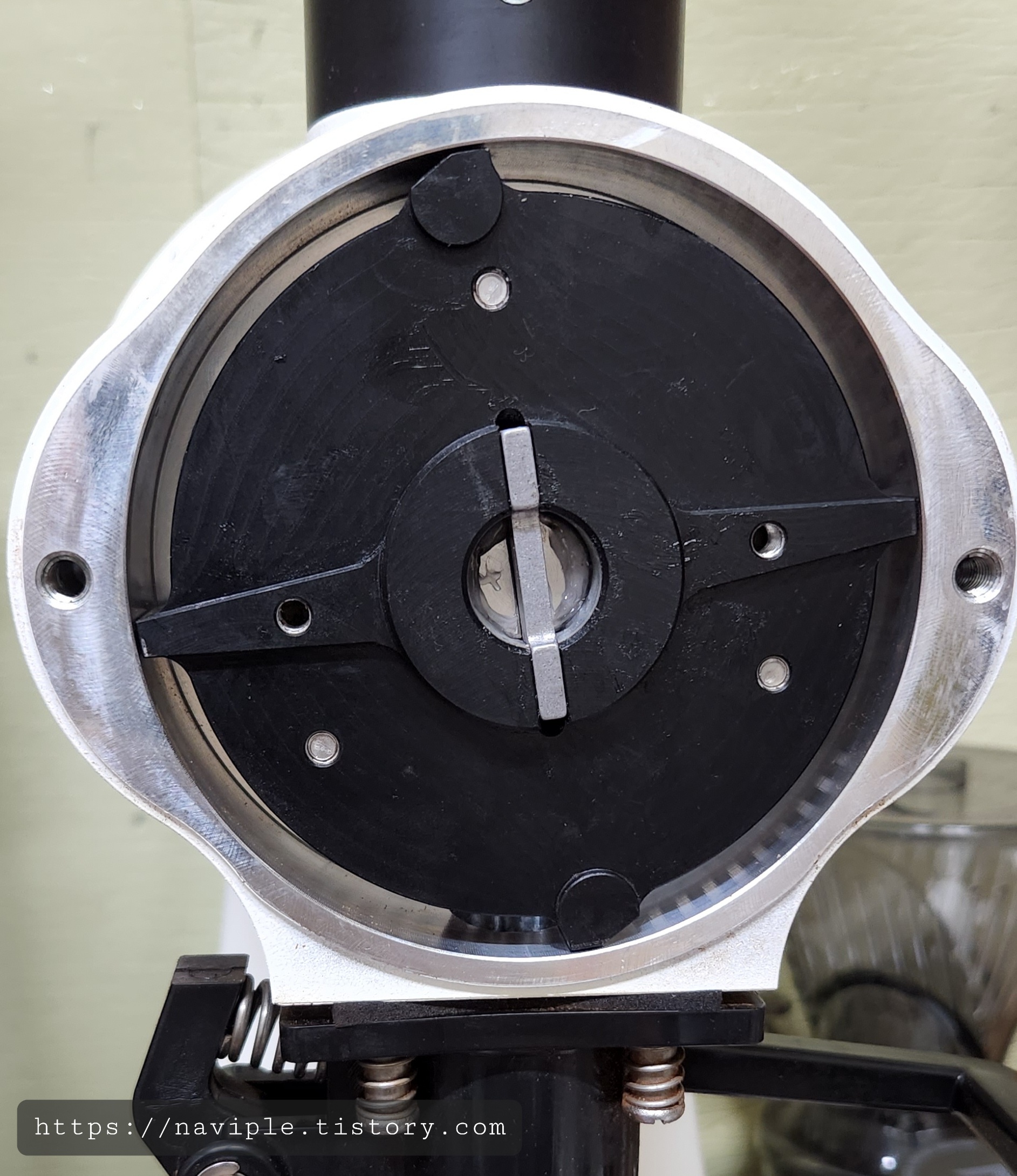 상판을 분리한 모습입니다.분쇄도 조절 부분을 돌리면 가운데 보이시는 원형 부분이 앞으로 나오면서 회전 버를 밀어주어 분쇄도를 조절하는 방식입니다.