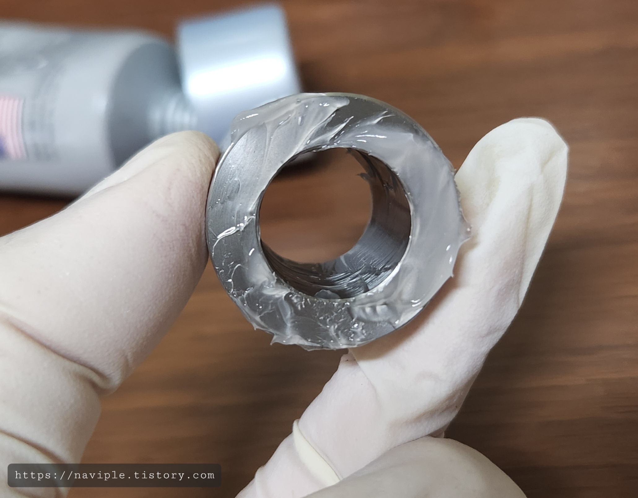 3번째 사진에 보이는 것처럼 축 안쪽에 도포되는 식용 윤활제는 얇게 펴 발라준 뒤 축을 장착하시는 것을 추천드립니다