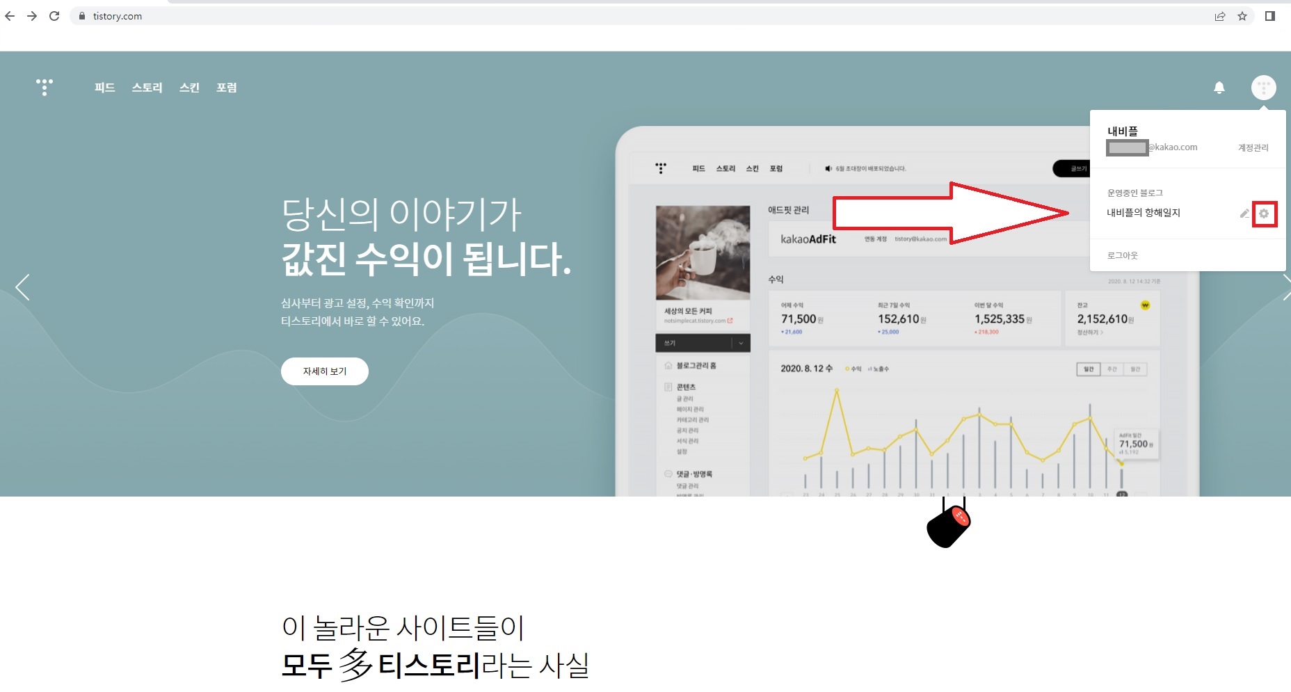 - 티스토리 메인 화면에서 톱니바퀴 모양을 클릭하여 블로그 관리 페이지로 접속합니다.