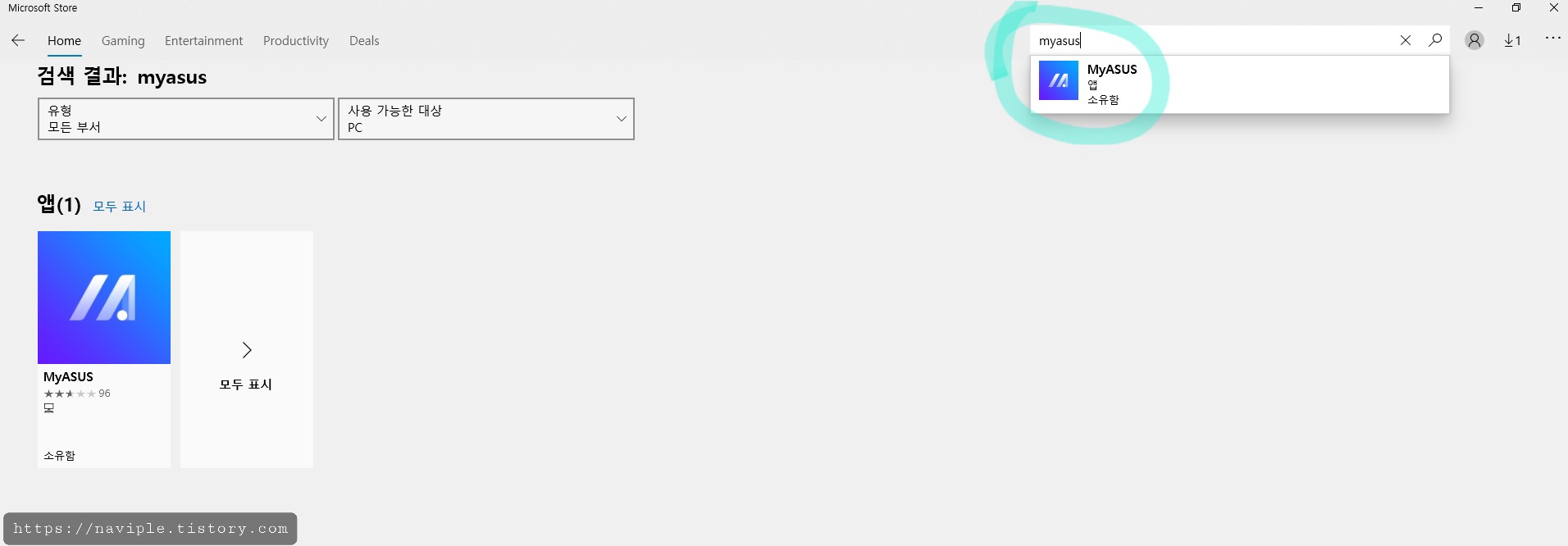 1. 마이크로소프트 스토어에 접속하여 My Asus 앱을 설치합니다